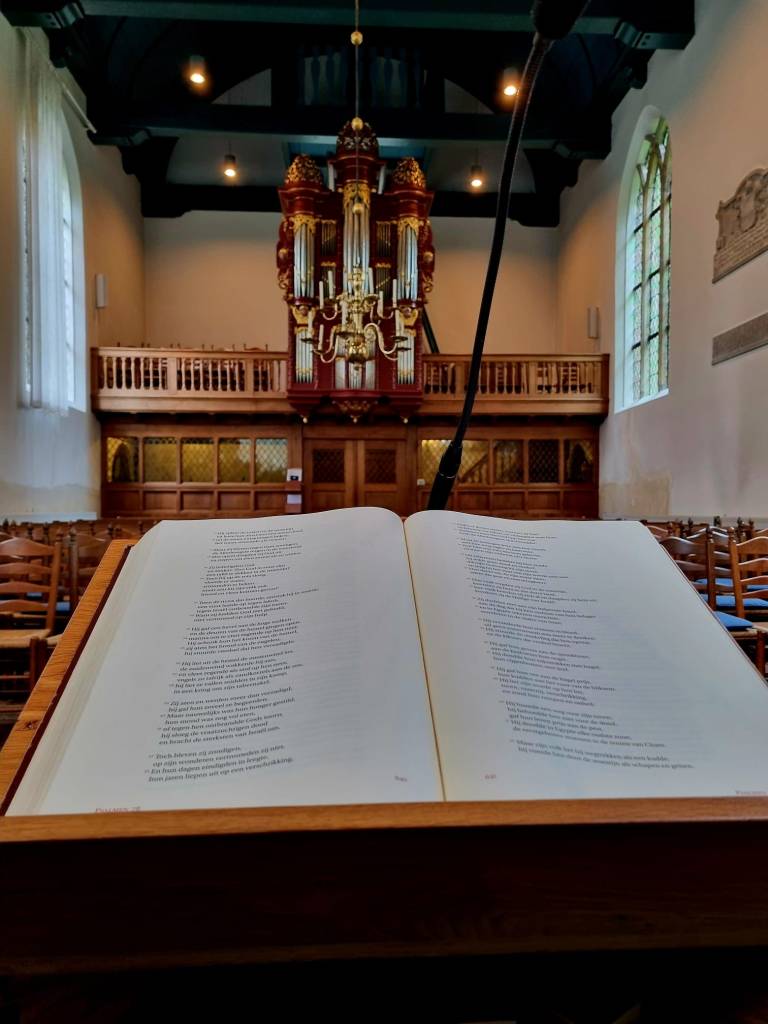 Dit is het interieur van de kerk vanuit het perspectief van de predikant, die de bijbel voor zich heeft liggen. Op de achtergrond is een orgel te zien.