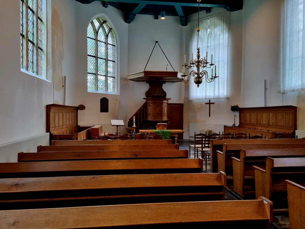 Dit is het interieur van de kerk tegenwoordig. Sikke heeft op een van deze kerkbankjes of stoelen plaatsgenomen om te luisteren naar de dienst die op zondagen werden gehouden.