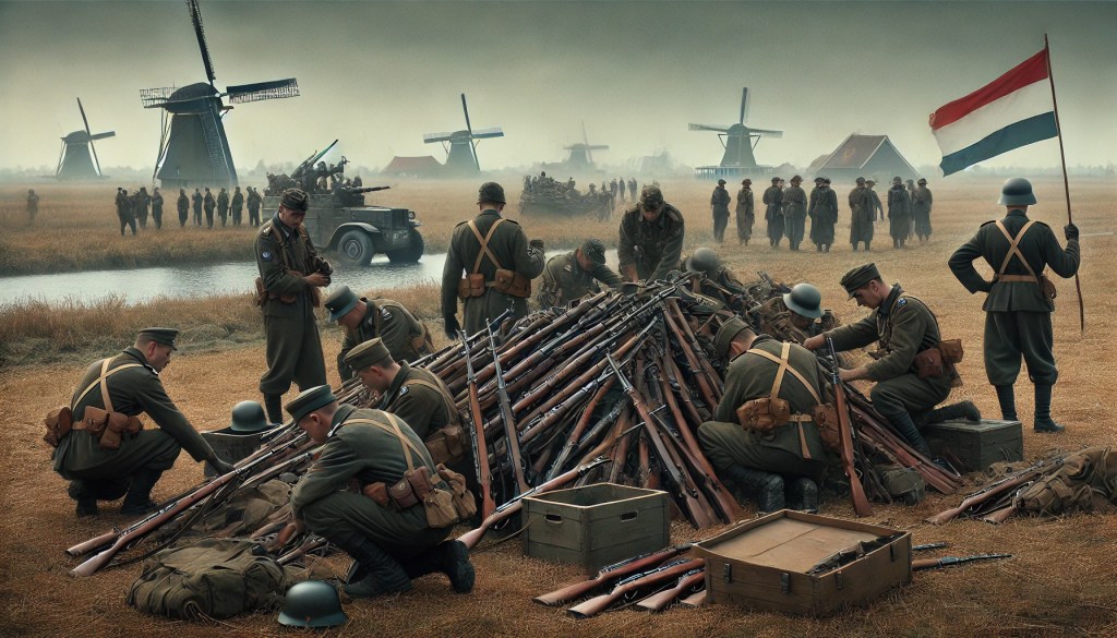 Creëer een historisch plaatje van het Nederlandse leger tijdens de capitulatie/demobilisatie van 1940.