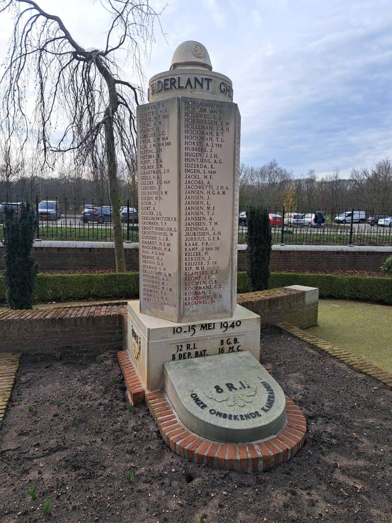 In het begin van 2024 bezocht ik samen met een groep vrienden de Grebbeberg. Het eerste wat opvalt is een monument met twee leeuwen en een kruis in het midden. Onder het kruis staat de tekst: ‘Den Vaderlant Ghetrouwe’. Dit monument symboliseert de opoffering van de gesneuvelde militairen voor de vrijheid van Nederland. Op de militaire begraafplaats zelf zijn meerdere monumenten te vinden. Een bijzonder monument op de militaire begraafplaats is de gedenkzuil van het achtste Regiment Infanterie. Op deze zuil staan de namen van militairen die sneuvelden als onderdeel van dit regiment.