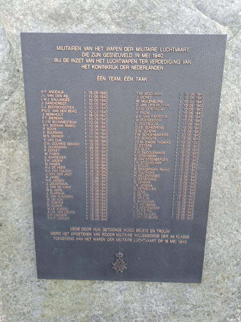Tijdens een bezoek aan het Nationaal Militair Museum liepen een medestudent en ik in de omgeving van de voormalige vliegbasis Soesterberg. Vervolgens stuitten we op het monument voor gevallen vliegers. Dit monument herdenkt alle vliegers die zijn omgekomen tijdens conflicten waar Nederland aan deelnam, inclusief de meidagen van 1940. Verderop staat ook een oorlogsmonument met een plaquette waarop de namen van gesneuvelde militairen van de militaire luchtvaart te zien zijn. Deze militairen kwamen om het leven tijdens de meidagen van 1940.