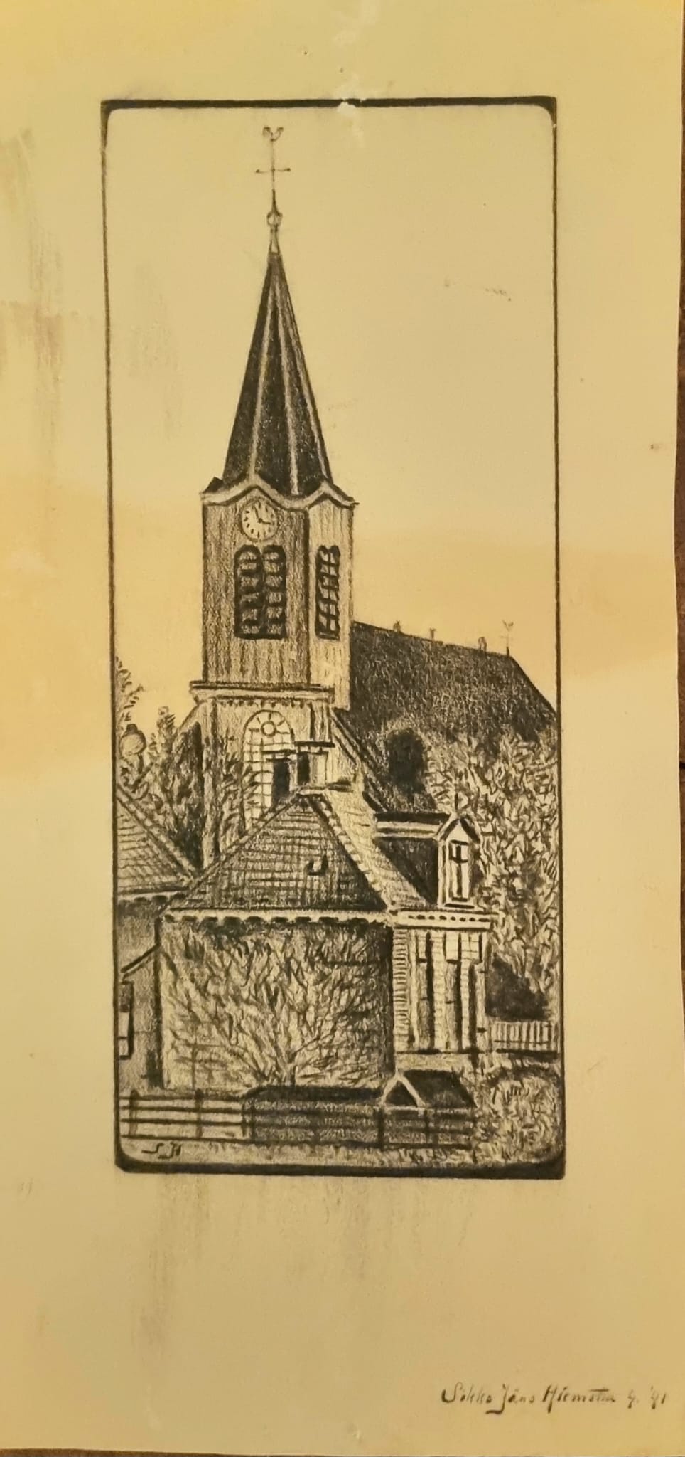 De bovenstaande afbeelding is een tekening van de kerk in Oudega (W). De tekening laat zien hoe de kerk er ongeveer uitzag. Deze tekening is gemaakt door Sikke in 1941.