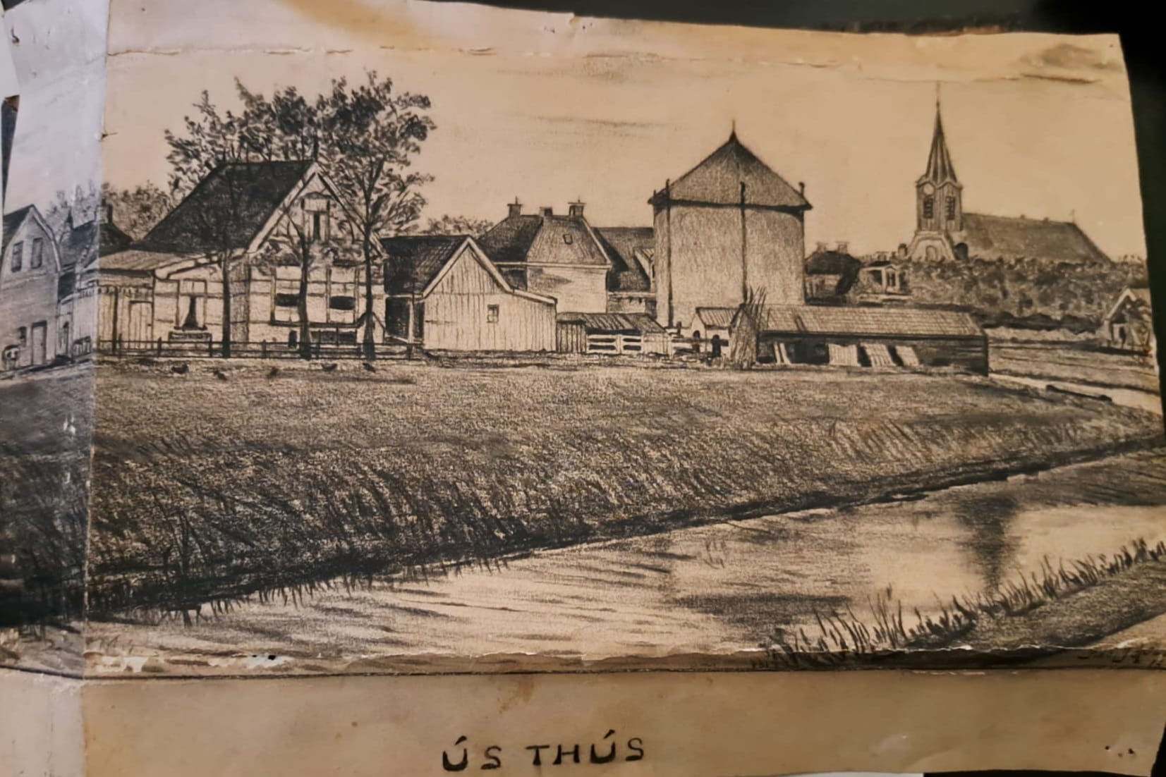 Sikke tekende graag en maakte regelmatig tekeningen voor zijn familieleden. Zo maakte hij ook een tekening van Oudega, met daaronder de tekst “Ons Thuis”. Ik heb de plek opgezocht waar Sikke vermoedelijk stond toen hij deze tekening maakte.