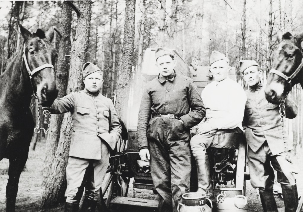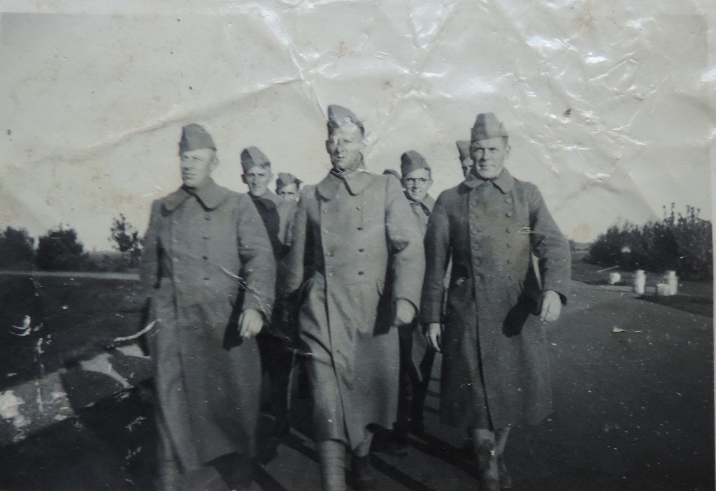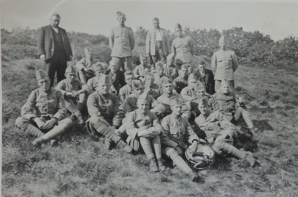 Zo zagen de uniformen van soldaten eruit tijdens de Nederlandse mobilisatie. Sikke zit in het midden van de groep (met bril en zonder mutsje). De exacte datum en locatie van deze foto zijn onbekend.